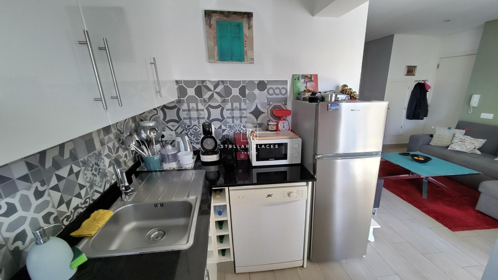 The apartment features a terrace off the lounge area, a fully equipped kitchen leading onto the living, a master bedroom with built in cupboards and a modern bathroom.